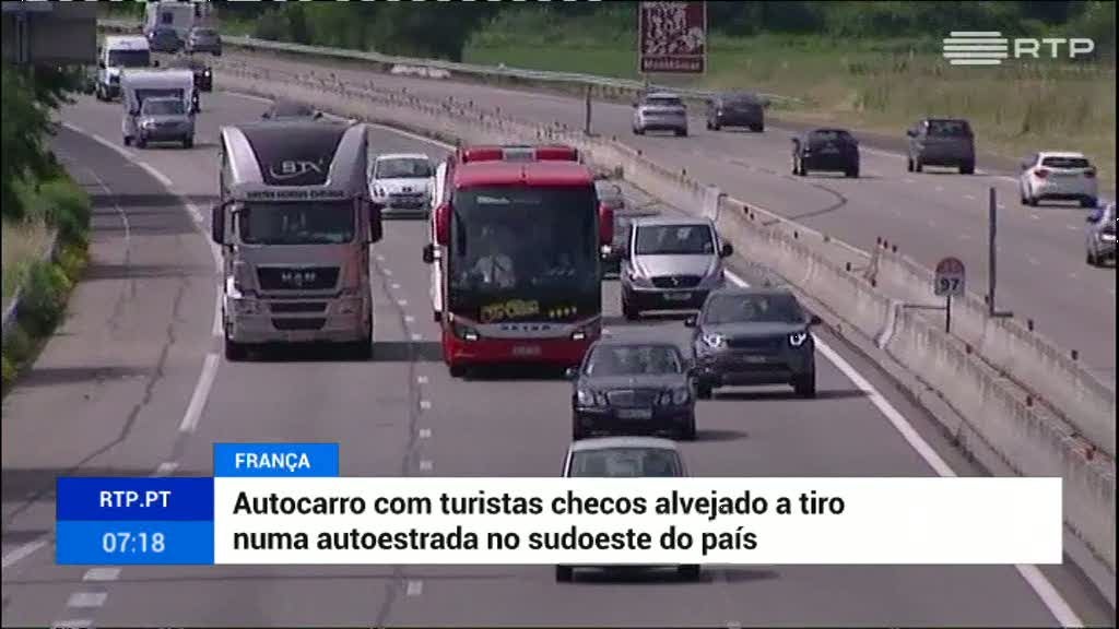 Um autocarro que transportava 75 turistas checos, incluindo crianças, foi alvejado numa autoestrada no sudoeste de França. Seis passageiros ficaram feridos com os estilhaços dos vidros. As primeiras investigações apontam para que o atirador tenha utilizado armas de caça.