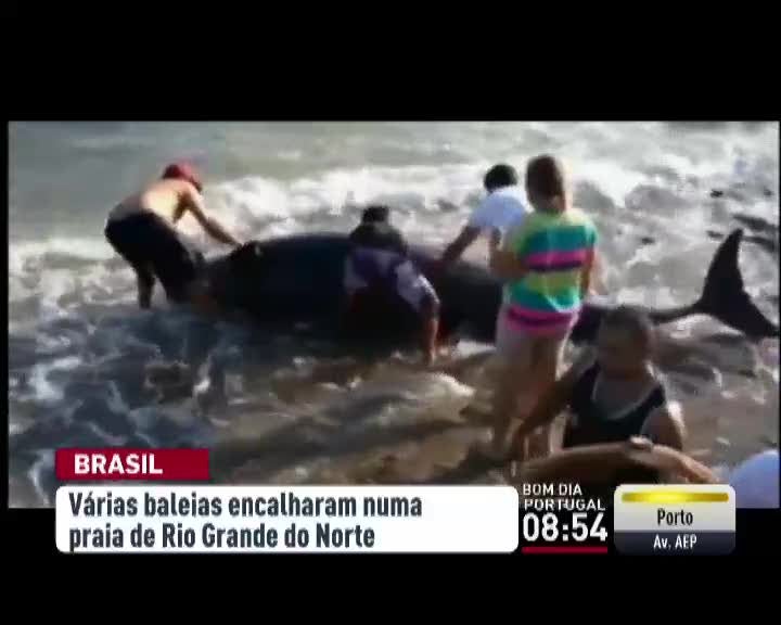 Dezenas de baleias-piloto encalharam numa praia do estado brasileiro do Rio Grande do Norte, no nordeste do país. A maior parte foi empurrada de volta para o mar, mas pelo menos seis animais morreram. Os bóologos não têm uma explicação para o fenómeno, pois esta espécie não costuma frequentar zonas costeiras. A marinha mantém-se vigilante. Algumas das baleias empurradas de volta para o mar continuam muito perto da costa e tentam voltar para o areal, onde podem encalhar novamente. As baleias-piloto adultas podem atingir até 8 metros e meio, pesam várias toneladas e têm cor negra.