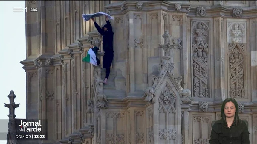 O protesto durou 16 horas. Um homem com uma bandeira palestiniana subiu este sábado à torre do Big Ben, em Londres. Só perto da meia-noite é que o ativista foi retirado do Palácio de Westminster. Já detido, o cidadão britânico foi recebido com aplausos. Pede liberdade da Palestina e diz estar em protesto contra a alegada cumplicidade entre o Governo britânico e o Estado de Israel.