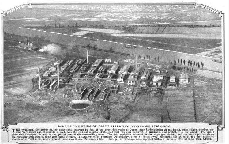 Uma explosão de aproximadamente 450 toneladas de mistura de sulfato de amónio e de nitrato de amónio fertilizante matou 565 pessoas e 1952 ficaram feridas.