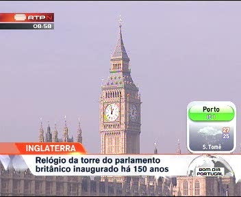 O relógio do Big Ben, instalado na torre do Parlamento britânico faz 150 anos. Big Ben é o nome técnico dado ao sino de 13 toneladas, mas acabou por ser também a designação popular da torre e do relógio. O relógio tem quatro faces com sete metros de diâmetro, continua a ser mecânico e mantém uma precisão notável. O sino foi ouvido pela primeira vez a 11 de Julho de 1859.