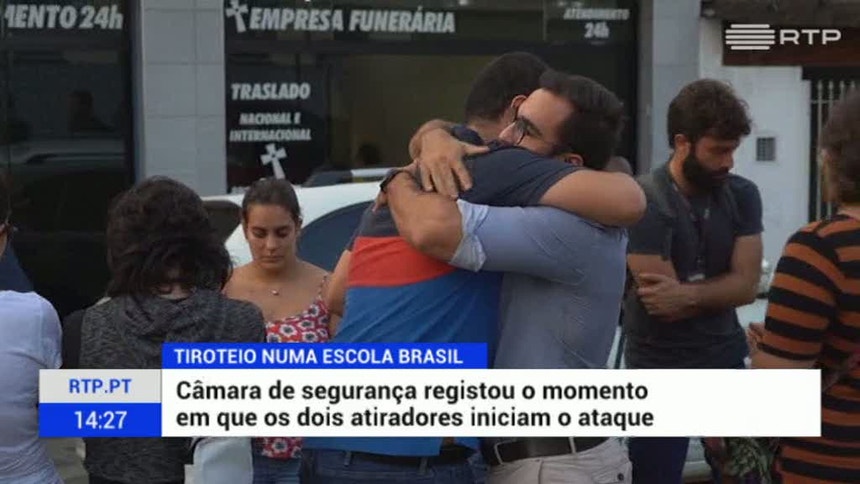 Uma câmara de segurança registou o momento em que os dois atiradores entram na Escola Raul Brasil, em São Paulo, e começaram o tiroteio que provocou as mortes de oito pessoas.