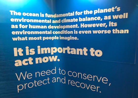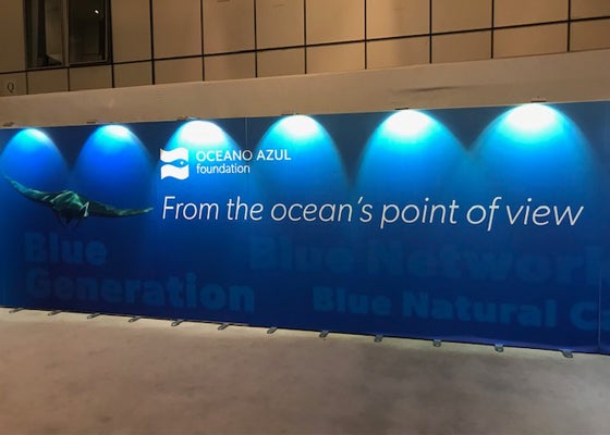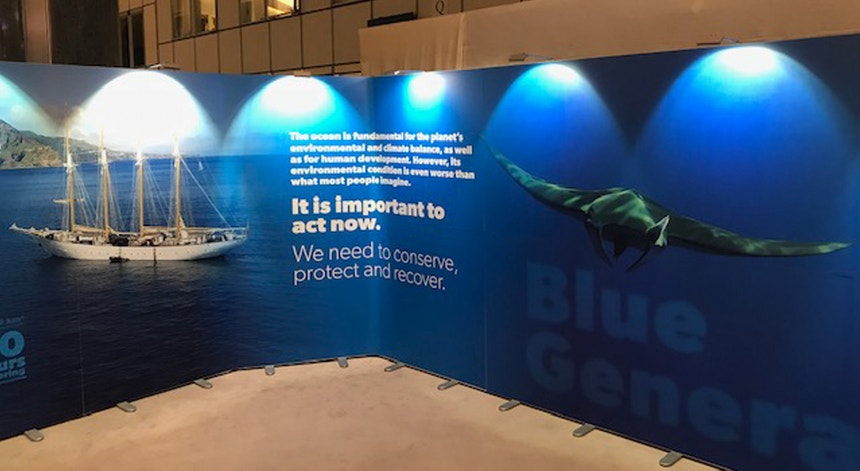 O azul, escuro e profundo, chama a atenção de quem passa. São fotografias de um mar imenso, de oceanos que guardam vida e que por ela lançam um pedido de ajuda aos eurodeputados em Bruxelas.