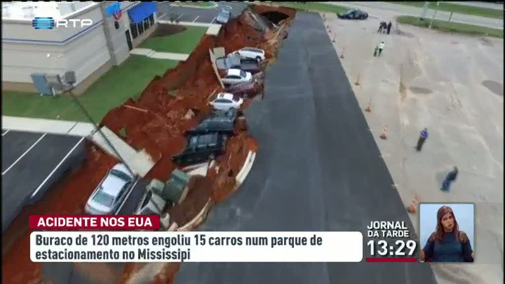 Um buraco de 120 metros engoliu, literalmente, 15 carros nos Estados Unidos. O incidente ocorreu sábado à noite no parque de estacionamento de um restaurante recém inaugurado, no Mississippi.