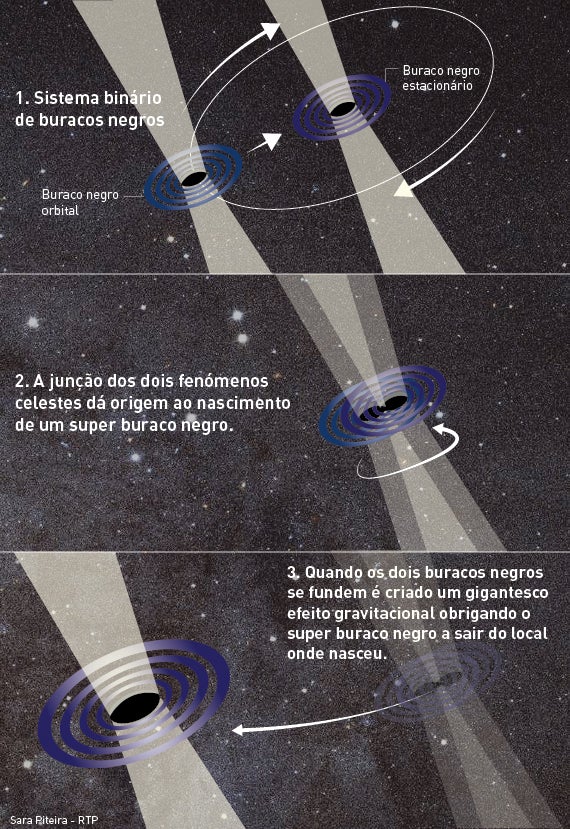 "O que estamos a estudar é o que poderá ser esse tipo de velocidades, porque isso depende dos eixos de rotação dos buracos negros iniciais. Se a rotação estiver alinhada de uma determinada maneira, a velocidade final do buraco negro poderá ser maior ou menor, o que irá ou não permitir escapar à galáxia."