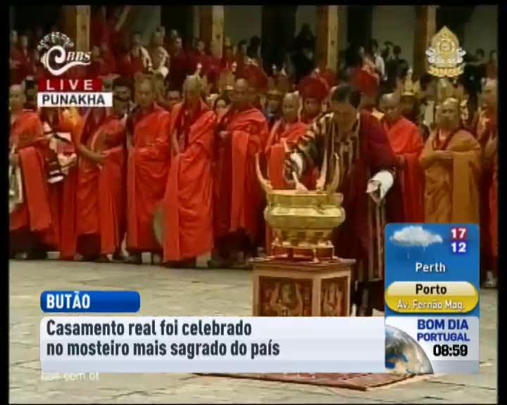 No Butão,um reino dos Himalais, foi dia de casamento real. O rei de 31 anos de idade, casou-se com a noiva de longa data. O casamento realizou-se no mosteiro Punhaka, o mais sagrado da capital do Botão. A seguir ao casamento, o rei e a mulher seguiram para uma cerimónia de purificação presidida pelo chefe budista da nação.