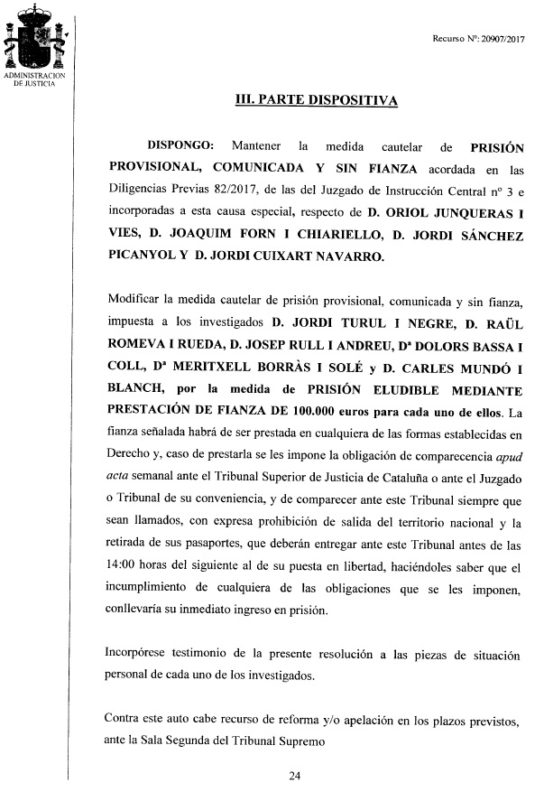 Já Raul Romeva, Carles Mundó, Dolors Bassa, Meritxell Borràs, Josep Rull e Jordi Turull, os outros seis antigos conselheiros da Generalitat que a Audiência Nacional tinha enviado para a prisão foi-lhes aplicada uma fiança de 100 mil euros.
