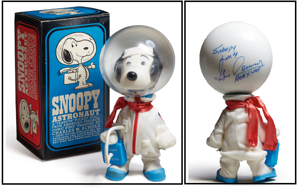 Um boneco do Snoopy Astronauta de 1969 assinada no capacete pelo Piloto do Módulo Lunar Apollo 10 Gene Cernan. O Snoopy foi a mascote do Programa de Conscientização do Voo Tripulado (MNE). Valores estimados pela leiloeira entre 1.731 e 2.596 euros, vendido por 23.797 euros.