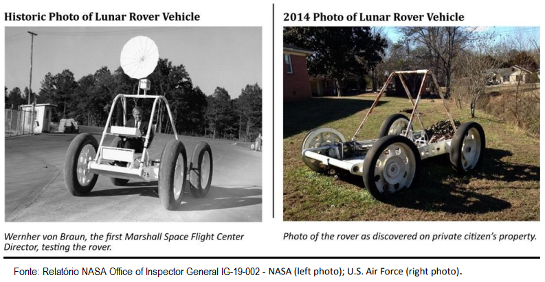 No caso do protótipo do Rover Lunar, o relatório explica que em 2014 um historiador da Força Aérea norte-americana que passava junto a um bairro residencial de Blountsville, Alabama, reparou num estranho veículo de rodas grandes e com uma parabólica.