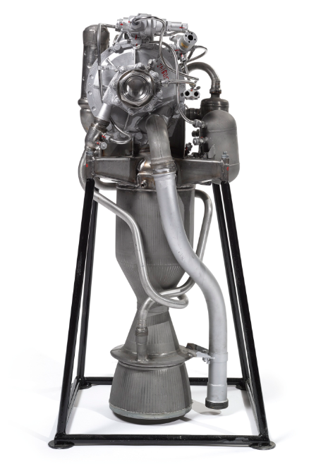 Um propulsor líquido V-751, de 1957, elaborado pelo engenheiro russo Alexei Isayev, construído a partir de várias ligas, montadas em um suporte de metal preto, aparentemente sem ter sido testado fogo.