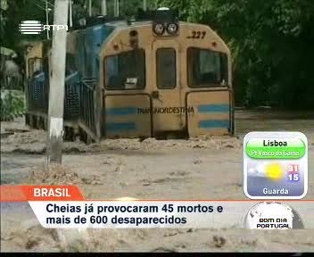 As autoridades brasileiras continuam a procurar as 600 pessoas desaparecidas nas cheias que atingiram o nordeste. Nos estados de Alagoas e Pernambuco estão confirmada 45 mortes. Novas imagens mostram agora o momento em que uma cidade é atingida pela força da água. No total, 54 municípios foram afectados pelas chuvas. De acordo com o último balanço da Protecção Civil mais de 181 mil pessoas foram afectadas pelo mau tempo.