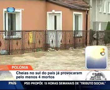 Cheias repentinas na Europa Central provocaram a morte a pelo menos quatro pessoas. O país mais afectado pelo mau tempo é a Polónia. As cheias desalojaram cerca de dois mil pessoas no sul do país. Os ventos fortes, o frio e a chuva afectam ainda a República Checa e a Hungria. Na República Checa há mesmo mais de dez mil habitantes estão luz.