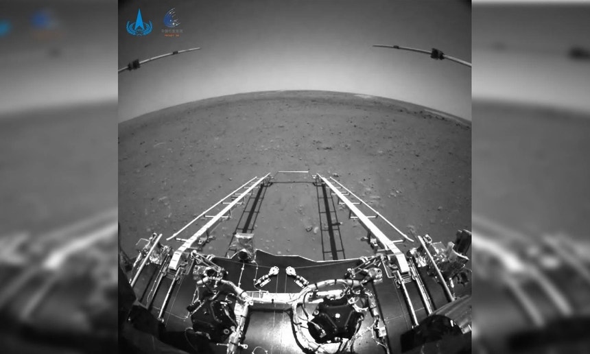 A Administração Espacial Nacional da China (CNSA) divulgou esta quarta-feira as primeiras imagens de Marte captadas pelo rover Zhurong (Deus do Fogo). Uma das imagens, monocromática, revela com total nitidez a visão frontal do rover ainda instalado na plataforma de pouso que o transportou até à superfície marciana e a segunda dá conta da abertura com sucesso dos painéis solares de Zhurong.