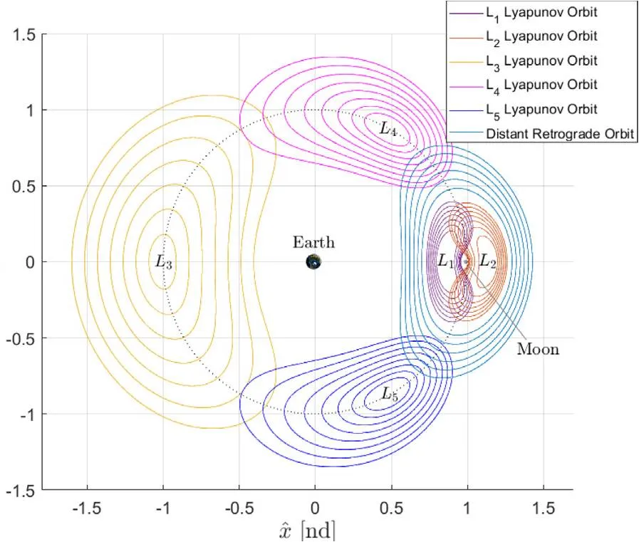 O novo estudo aborda o Problema Circular Restrito de Três Corpos (CR3BP) e o problema de povoar o espaço cislunar com fragmentos de detritos. Crédito: Clark/Frueh/Purdue University