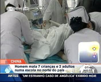 Na China, um homem armado com um machado entrou numa escola e matou sete crianças e dois adultos. O homem de 48 anos feriu ainda 11 pessoas, duas das quais estão em estado grave. Após o massacre, o homem regressou a casa e suicidou-se. Desconhecem-se as motivações do assassínio. Na China, desde Março, este é o quinto ataque a uma escola. Acontece já depois das autoridades terem reforçado as medidas de segurança.