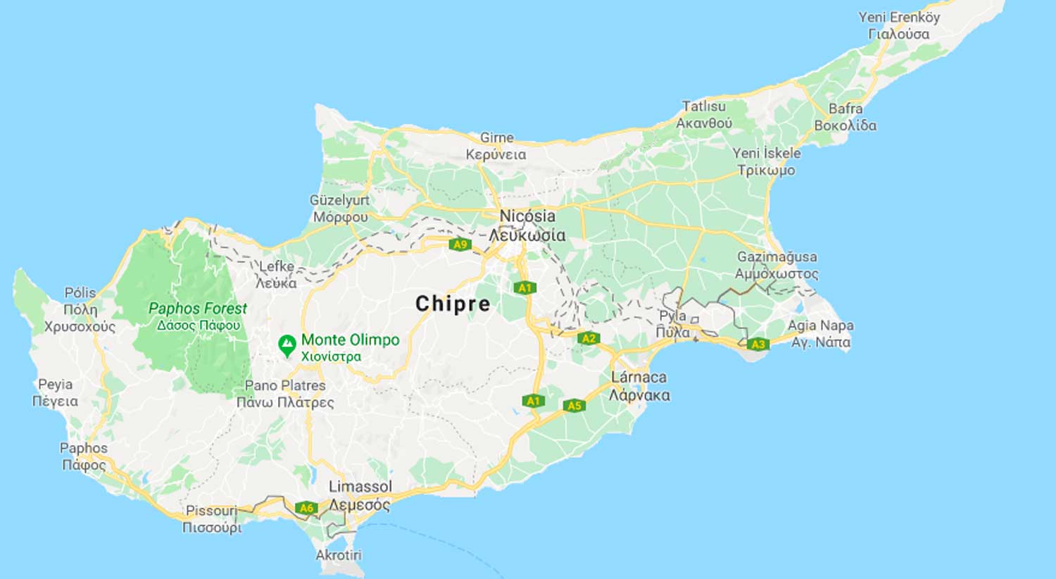 A ilha de Chipre. A "Linha Verde" é o pontilhado que separa o território a meio. Fonte: Google Maps