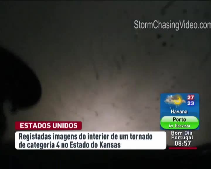 Cientistas norte americanos conseguiram registar imagens do interior de um tornado. Os dois caçadores de tornados usaram um veículo modificado para aguentar ventos ciclónicos. O tornado de categoria 4 formou-se no estado do Kansas, a algumas centenas de quilómetros de distância do outro tornado que, no mesmo dia, atingiu a localidade de Moore, no Oklahoma. A tempestade atingiu ventos superiores a 240 quilómetros por hora. O tornado danificou uma das portas e o tejadilho do veículo onde estavam os cientistas que mesmo assim conseguiram gravar o momento.