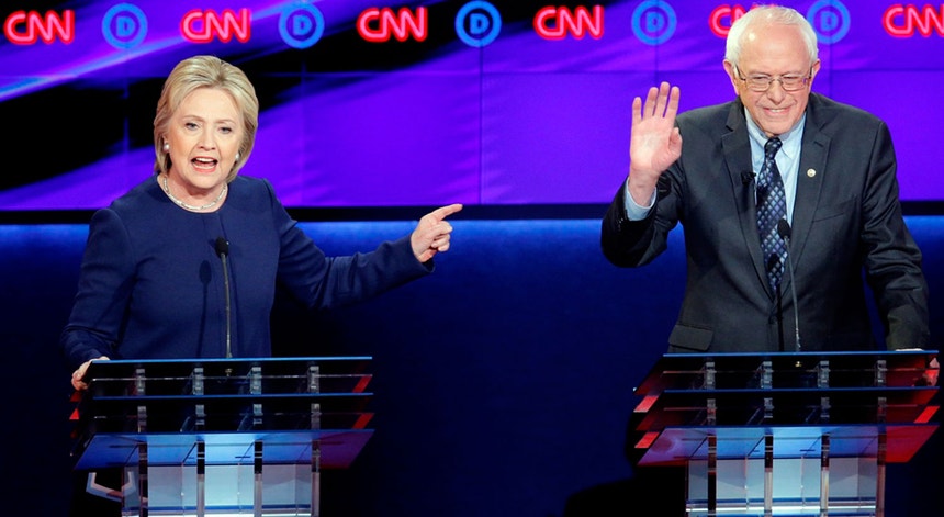 Num momento mais tenso do debate, a candidata interrompeu Sanders, que num tom brusco avisou: “Com licença, estou a falar!”.