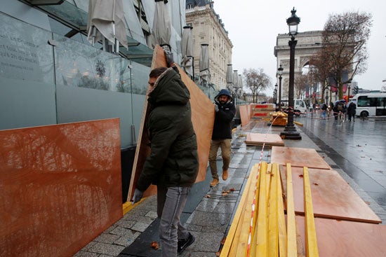 Ao longo daquela que é uma das principais avenidas de Paris, os comerciantes colocaram proteções frente às suas lojas.