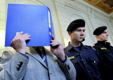 O austríaco de 73 anos apareceu no tribunal a tapar a cara com uma pasta azul.