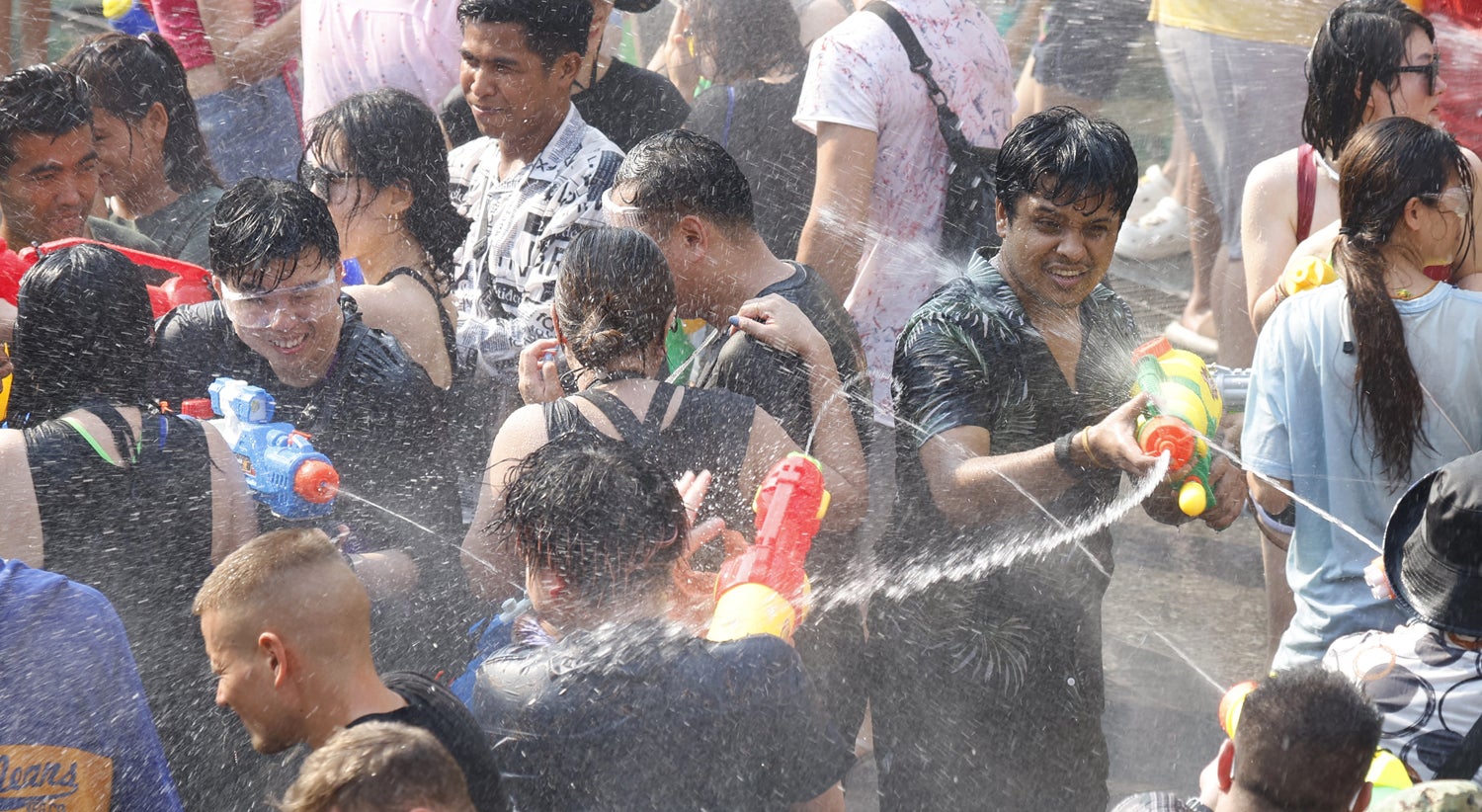 Nas ruas, ninguém permanece com a roupa seca. Desde baldes de água gelada a mangueiradas, a “purificação” está em todo o lado. Os vendedores ambulantes fazem negócio com bolsas impermeáveis, pistolas de água e óculos de proteção para os esguichos.