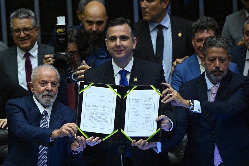 "O dia de hoje será lembrado não apenas como um marco histórico, mas também como um ponto de virada, um divisor de águas. É aqui que mudamos a trajetória do Brasil. Esse dia representa o início de um novo país rumo ao progresso. É uma conquista do Congresso Nacional, do povo brasileiro", disse o presidente do Congresso, o senador Rodrigo Pacheco, citado pela Agência Brasil.
