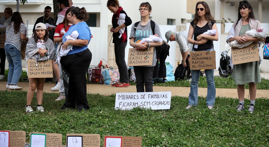 Os manifestantes seguraram ao colo bonecos que simbolizaram as mortes de mais de 16 mil crianças palestinianas em Gaza.