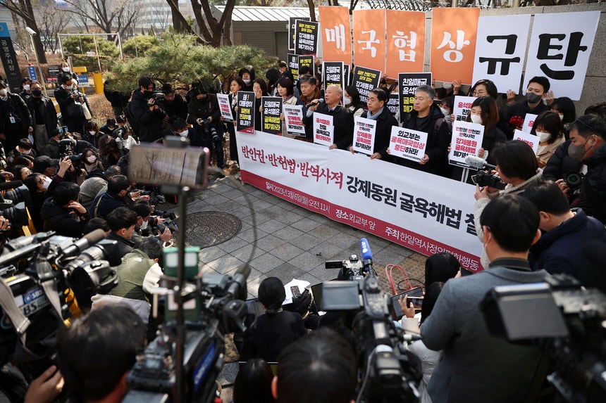 Durante a conferência de imprensa de Park, manifestantes reuniram-se na rua, em frente do Ministério das Relações Exteriores em Seul, para dizerem: “É uma vitória completa do Japão, que afirmou que não pagará um único iene pela questão do trabalho forçado”, reiterou Lim Jae-sung.
