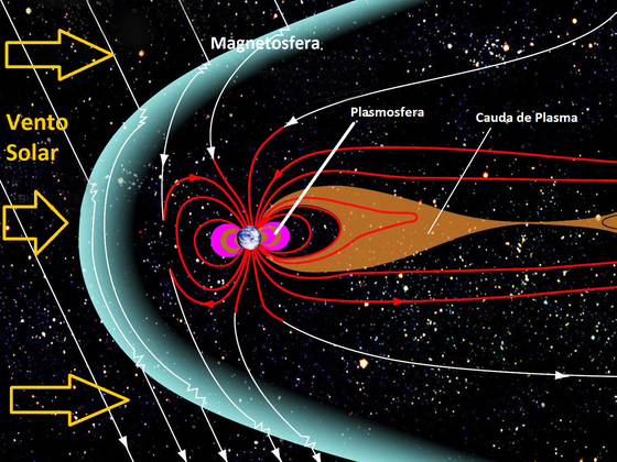 A região do espaço ao redor da terra é ocupada por um campo magnético, chamado de magnetosfera, está cheio de plasma criado pela atmosfera sendo ionizada pela luz solar.