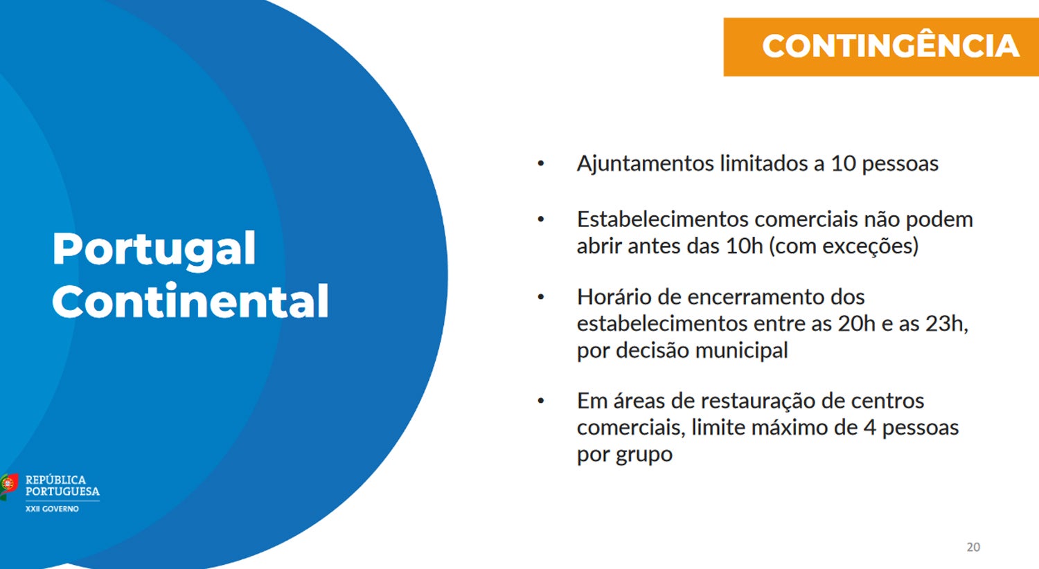 O Conselho de Ministros esteve reunido esta quinta-feira para definir as medidas que serão implementadas na fase de contingência, no âmbito da pandemia de covid-19, que vigorará em todo o país a partir de terça-feira. Os ajuntamentos passam a estar limitados a dez pessoas, serão criadas brigadas distritais de intervenção rápida nos lares e os horários de trabalho serão desfasados de forma a evitar a concentração de pessoas na hora de ponta. Saiba mais aqui.