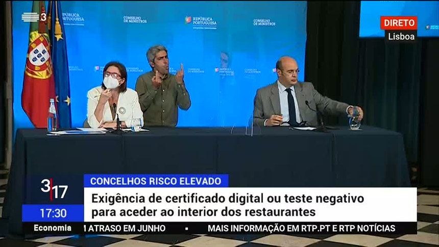 Os restaurantes em concelhos de risco elevado ou muito elevado vão passar a ter de exigir certificado digital ou teste negativo à covid-19 a partir das 19:00 de sexta-feira e aos fins de semana para refeições no interior, decidiu hoje o Governo, pondo fim ao encerramento obrigatório a partir das 15:30 aos fins de semana e feriados.