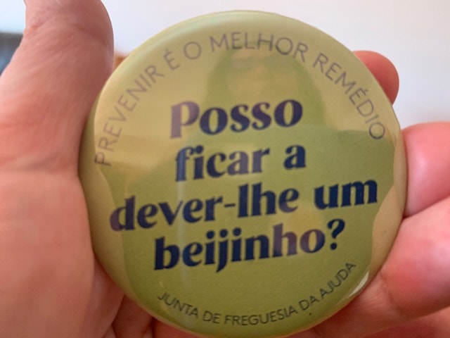Os crachás estão a ser distribuídos nas lojas locais, como supermercados e farmácias, procurando desincentivar os beijinhos e aliviando a pressão que se está a viver.