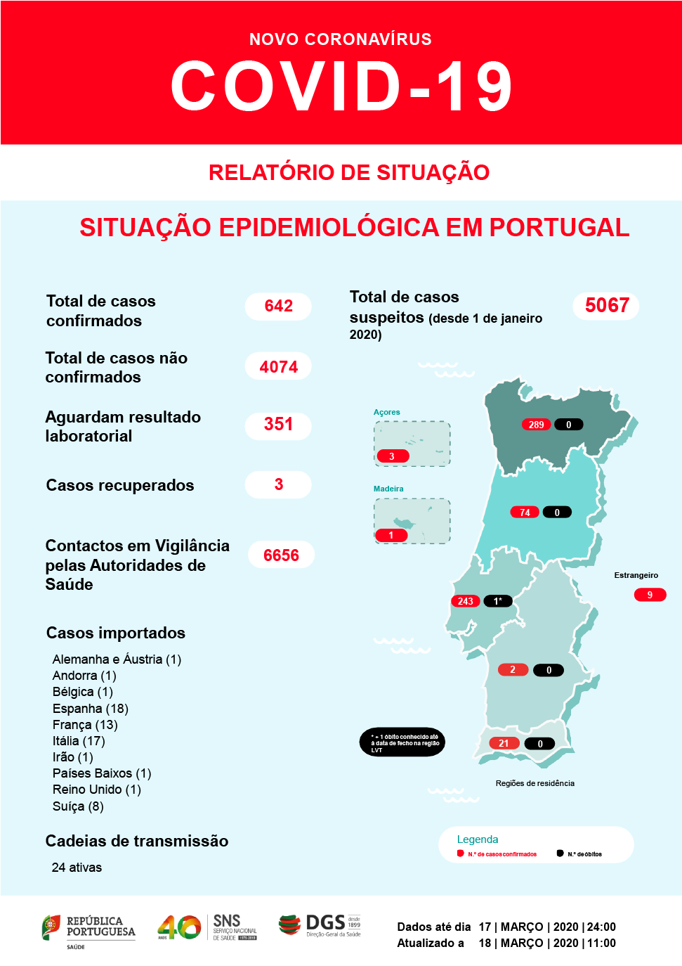 "Até 17 de março de 2020, foram testados um total de 2.911 casos suspeitos de Covid-19 por laboratórios públicos e privados, dos quais 85 são positivos", adianta a nota.