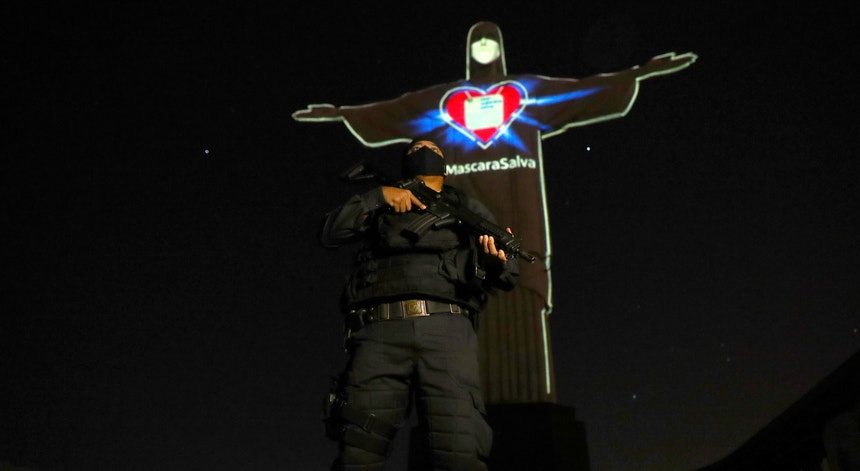 A estátua do Cristo Redentor do Rio de Janeiro mostrou-se no domingo com máscara de proteção para alertar a população para o seu uso durante a epidemia da covid-19.