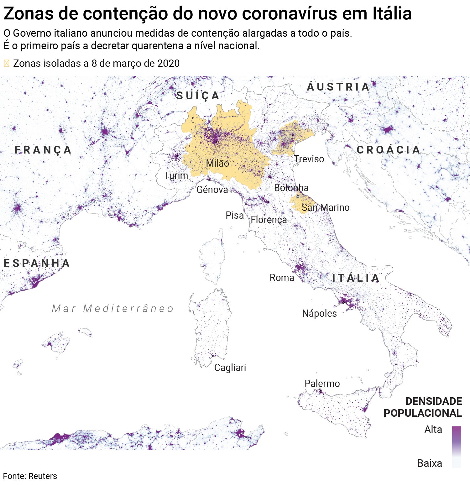 Itália é o primeiro país a alargar as medidas de contenção do novo coronavírus a todo o território. O primeiro-ministro italiano, Giuseppe Conte, anunciou na segunda-feira que as medidas de quarentena, já impostas no norte, vão ser estendidas a todas as regiões até dia 3 de abril.