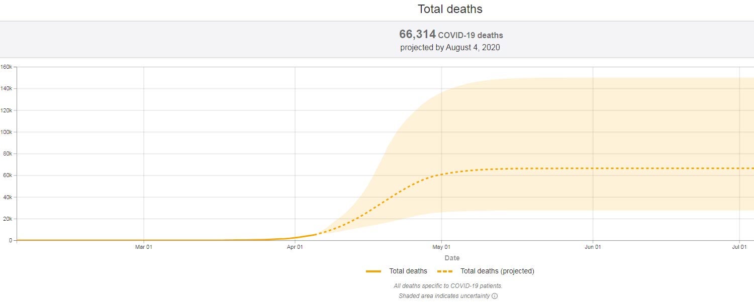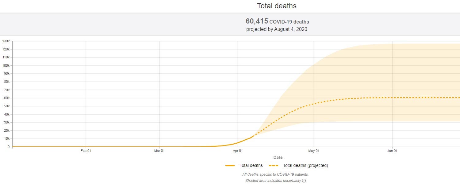 O valor estimado de vítimas mortais é inferior ao do Reino Unido. Este modelo aponta que nos Estados Unidos vão morrer, até 4 de agosto, 60.415 pessoas.