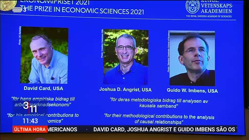 “A investigação deles melhorou substancialmente a nossa capacidade de responder às principais questões causais, o que tem sido uma grande vantagem para a sociedade”, acrescentou. Card nasceu em Guelph, no Canadá e é professor da Universidade da Califórnia, Berkeley. Angrist é professor do Instituto de Tecnologia de Massachusetts. Imbens nasceu em Eindhoven, na Holanda, e é professor da Stanford University, na Califórnia.