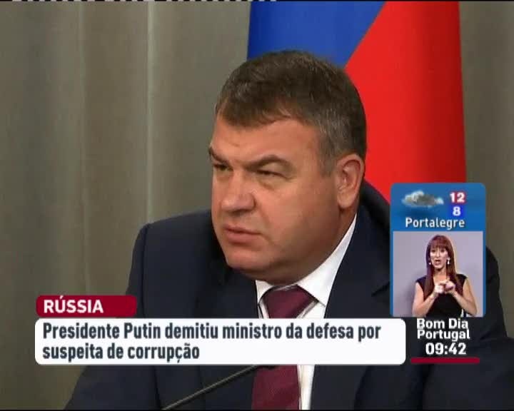 O presidente da Rússia demitiu o ministro da Defesa. Em causa está um escândalo de corrupção e fraude. Está entre os suspeitos de um caso de alegada má gestão de fundos públicos e da venda ilegal de imóveis, terrenos e ações do Ministério da Defesa. Os prejuízos foram avaliados em 74 milhões de euros.