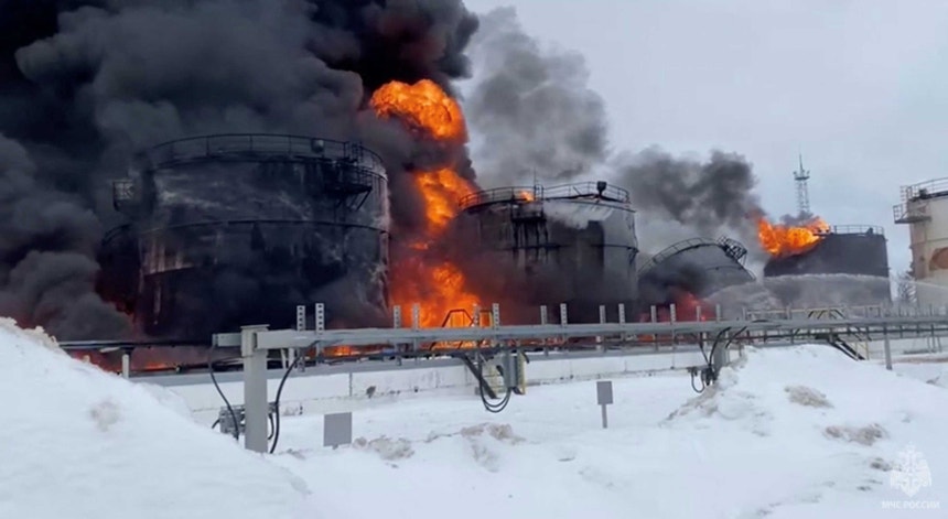 Um depósito de petróleo na cidade russa de Klintsy, na região fronteiriça de Bryansk, ficou esta sexta-feira em chamas depois de as forças militares russas terem abatido um drone ucraniano cujas munições caíram no local. Kiev já reivindicou a responsabilidade pelo ataque, após o qual 13 camiões dos bombeiros foram mobilizados. Não há, para já, registo de vítimas.