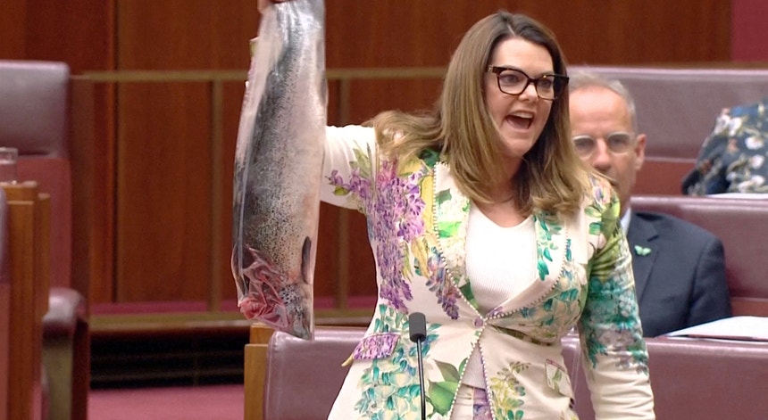 O Parlamento australiano viveu um momento inusitado. Uma deputada exibiu um salmão morto num saco de plástico. Um protesto de Sarah Hanson, do partido verde, que acusou o Governo de apoiar uma indústria de salmão tóxica e poluente.