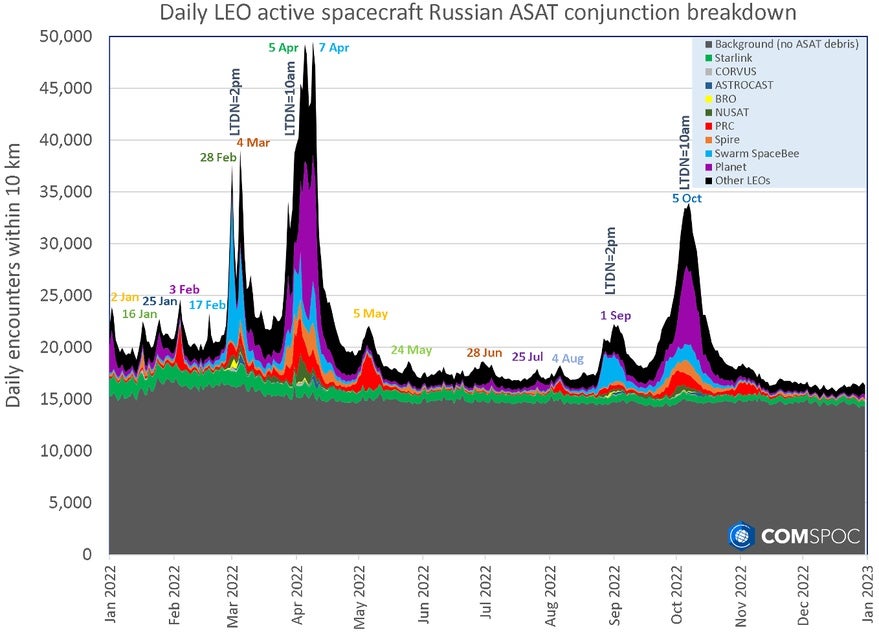 Este gráfico revela os picos em conjunções com satélites ativos em LEO causados por detritos russos ASAT. Crédito: COMSPOC