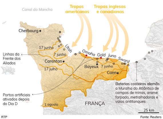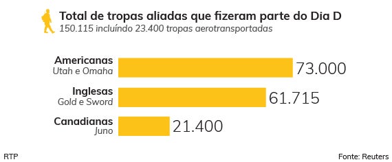 Ao todo, 83 115 soldados ingleses e canadianos, mais 73 000 do exército americano desembarcaram na costa da Normandia num espaço de 80 quilómetros das praias ao qual deram nomes de código de Utah, Omaha, Gold, Juno e Sword.