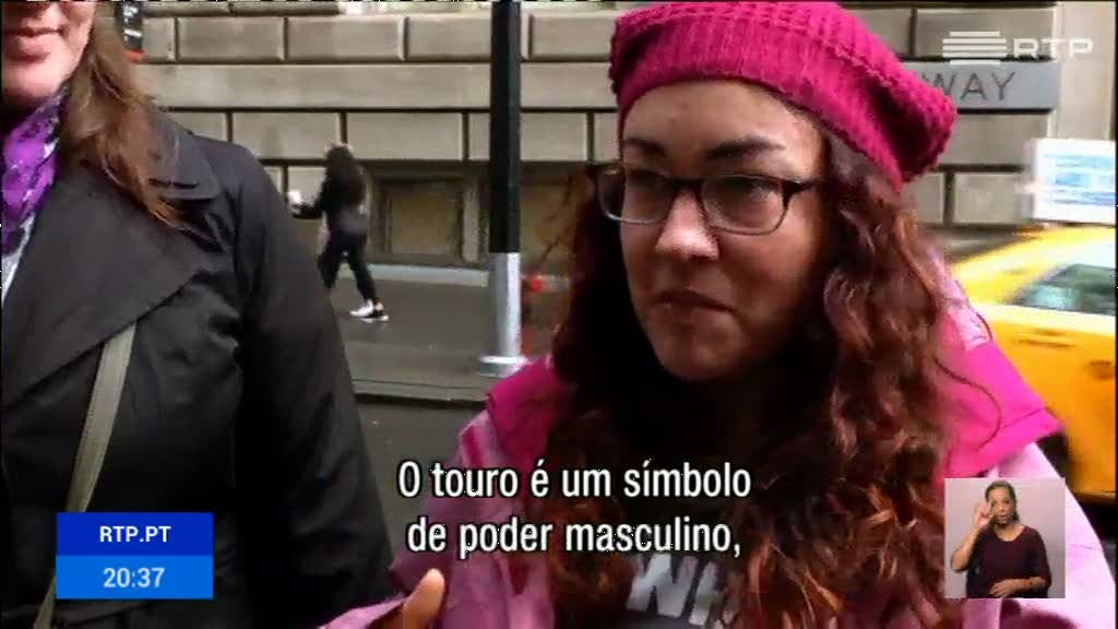 frente ao touro de bronze que simboliza o poder na zona financeira de Nova Iorque.