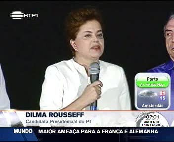 Dilma Rousseff, candidata do Partido dos Trabalhadores (PT) e do actual Presidente Lula da Silva, venceu a primeira volta das eleições presidenciais brasileiras ao alcançar 46,8 milhões de votos correspondente a 46,7 por cento dos votos válidos.