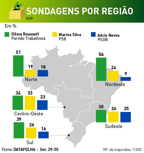 Dilma está mais à vontade nas regiões norte do Brasil, onde o afastamento em relação aos dois rivais é maior. À medida que se desce geograficamente, percebe-se que Marina e Aécio se aproximam da atual Presidente nas regiões do sul. A tendência, contudo, é sempre a mesma: Dilma na liderança, Marina atrás e Aécio com a menor percentagem de apoiantes.