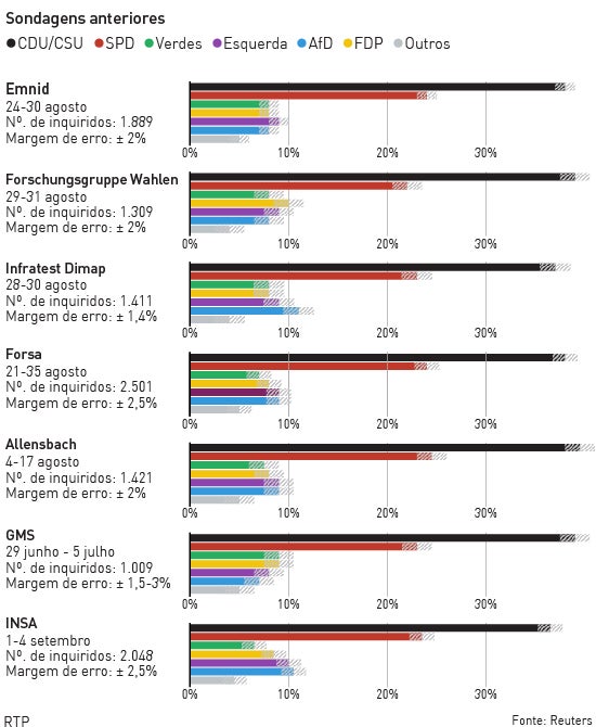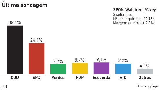 Segundo a sondagem diária SPON de 5 de Setembro, divulgada em Der Spiegel, a CDU passou dos 37,6 por cento das intenções de voto para 38,1 por cento - ou seja, um ganho de meio ponto percentual, numa sondagem com margem de erro de 2,5 por cento. O SPD permanece com uns modestos 24,1 por cento e as intenções de voto nos partidos mais pequenos mantêm-se estáveis.