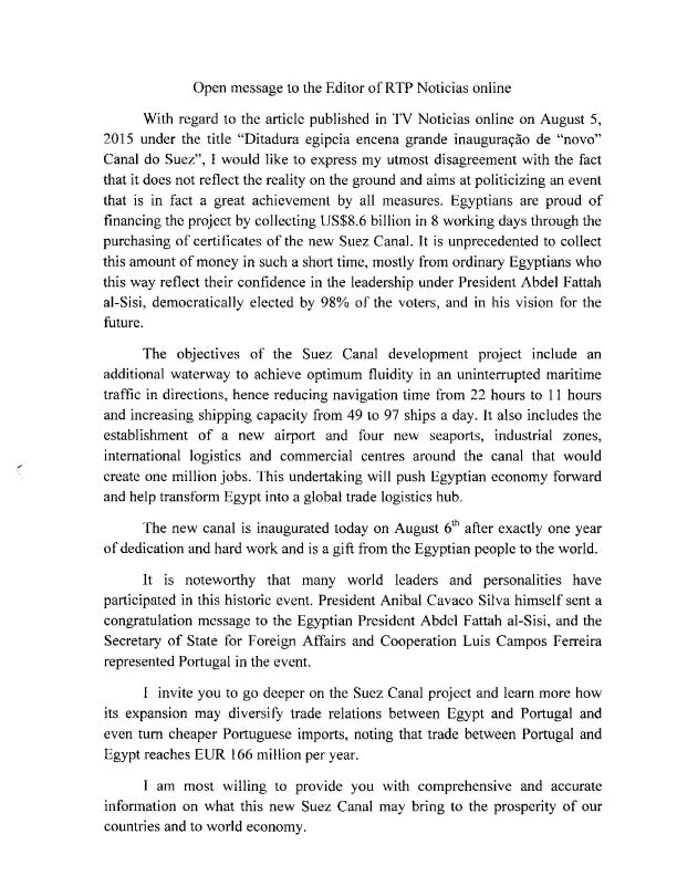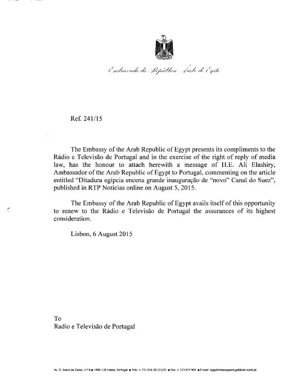 (Este artigo escrito na quarta-feira, 5 de agosto de 2015, é agora (6 de agosto) reeditado ao abrigo do direito de resposta, por solicitação do Embaixador do Egipto em Portugal, incluindo no final o texto enviado à redação do online da RTP pela Embaixada da República Árabe do Egipto.)
