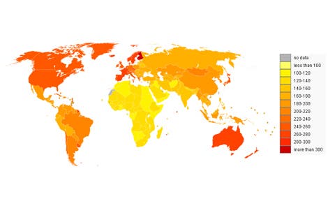 Mapa: Prevalência de Alzheimer e outras demências por 100.000 habitantes, em 2004 (Wikimedia Commons). Segundo um estudo da Harvard Medical School, 40 por cento das pessoas com mais de 85 anos têm Alzheimer, sendo uma doença mais comum nos países mais desenvolvidos, onde a esperança média de vida é superior.