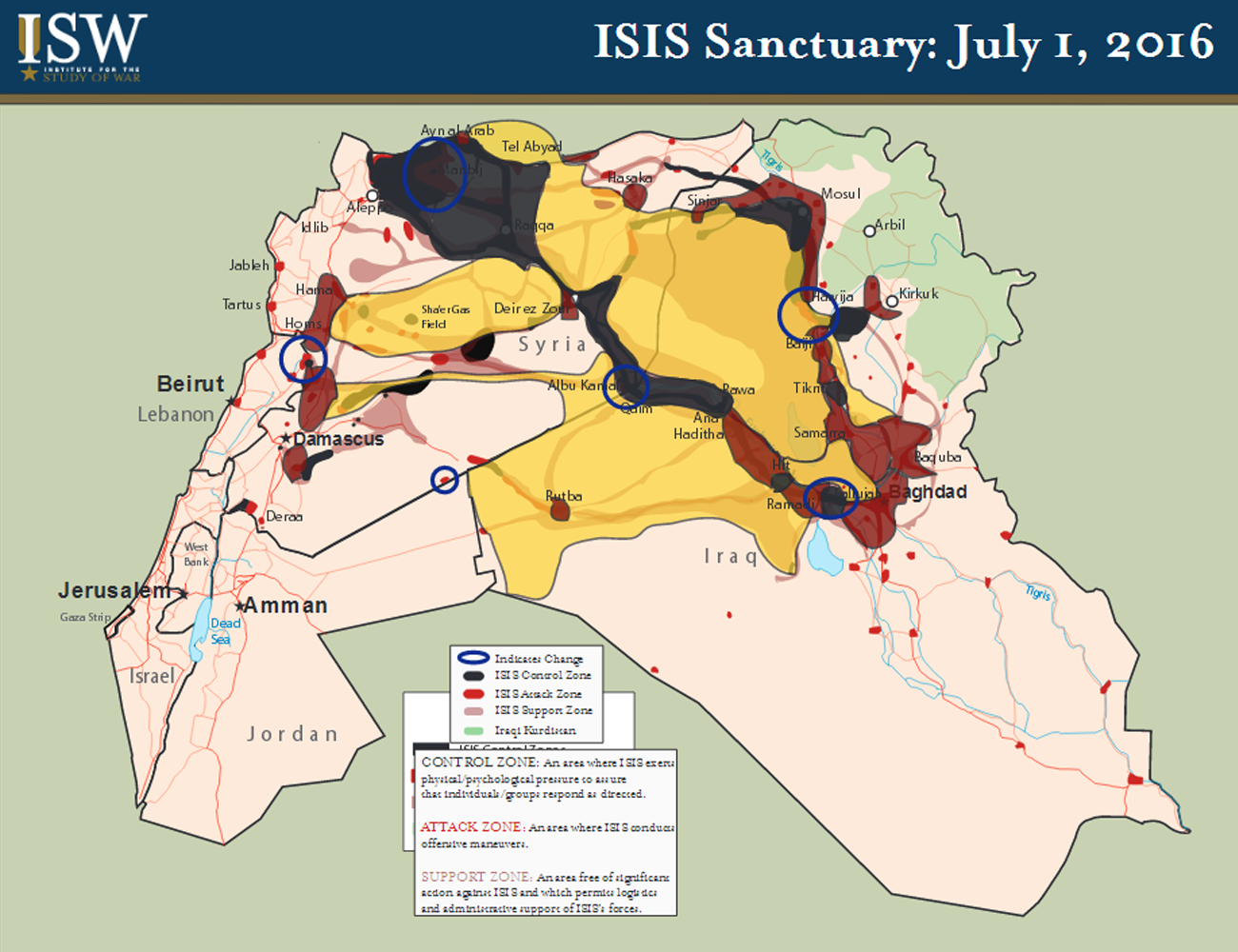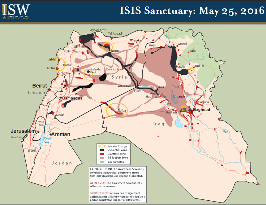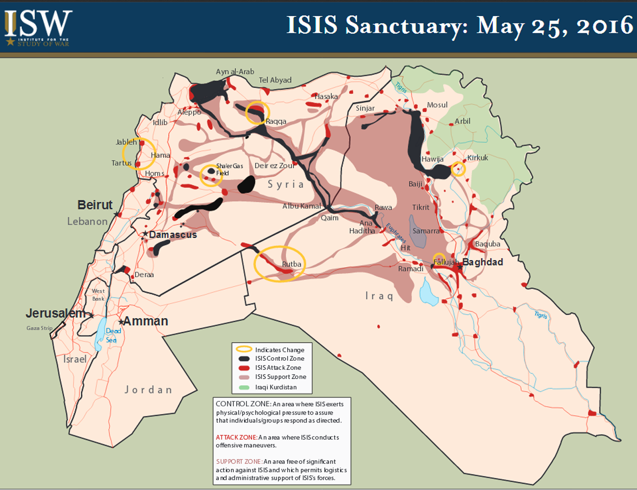 É o que demonstram dois mapas do Institute for the Study of War, referentes a maio e a julho de 2016.