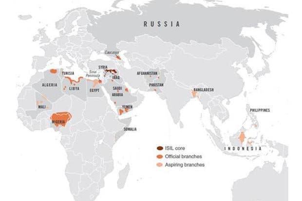 O mapa ficou à vista esta quarta-feira devido a uma "fuga" de informação e foi publicado unicamente pelo britânico Daily Star. Assinala a presença dos ramos "oficiais" do grupo no Egipto, na Argélia, na Arábia Saudita, no Afeganistão, no Paquistão, no Iémen, na Líbia, na Nigéria e na área do Cáucaso, a sul da Federação russa.